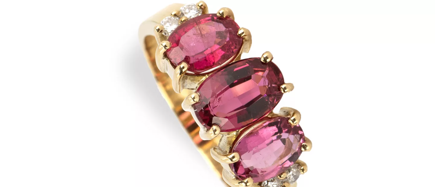 Rubellit-Diamantring: 750 Gelbgold, punziert, 4 kleine Diamanten, gesamt ca. 0,04 ct, 3 facettierte Rubellite im Ovalschliff, gesamt...