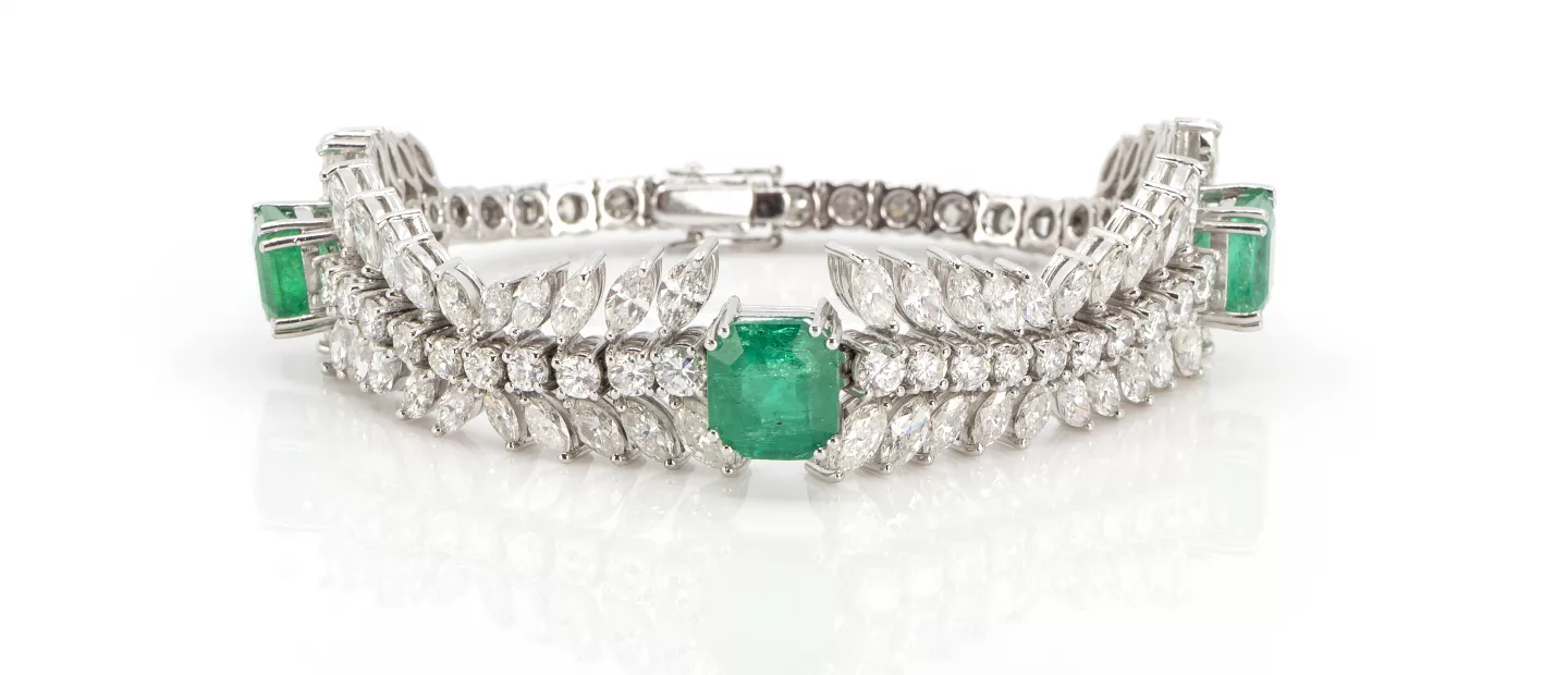 Diamant-Smaragdarmband: 750 Weißgold, geprüft, 44 Diamanten im Brillant- und 60 Diamanten im Navetteschliff, gesamt ca. 16,50 ct, 3...