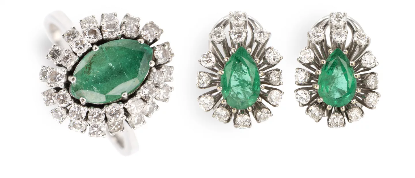 Smaragd-Diamantset: 3-tlg., 750 Weißgold, punziert, die Ohrclips gesamt mit 26 Diamanten im Brillantschliff, gesamt ca. 1,04 ct, der...