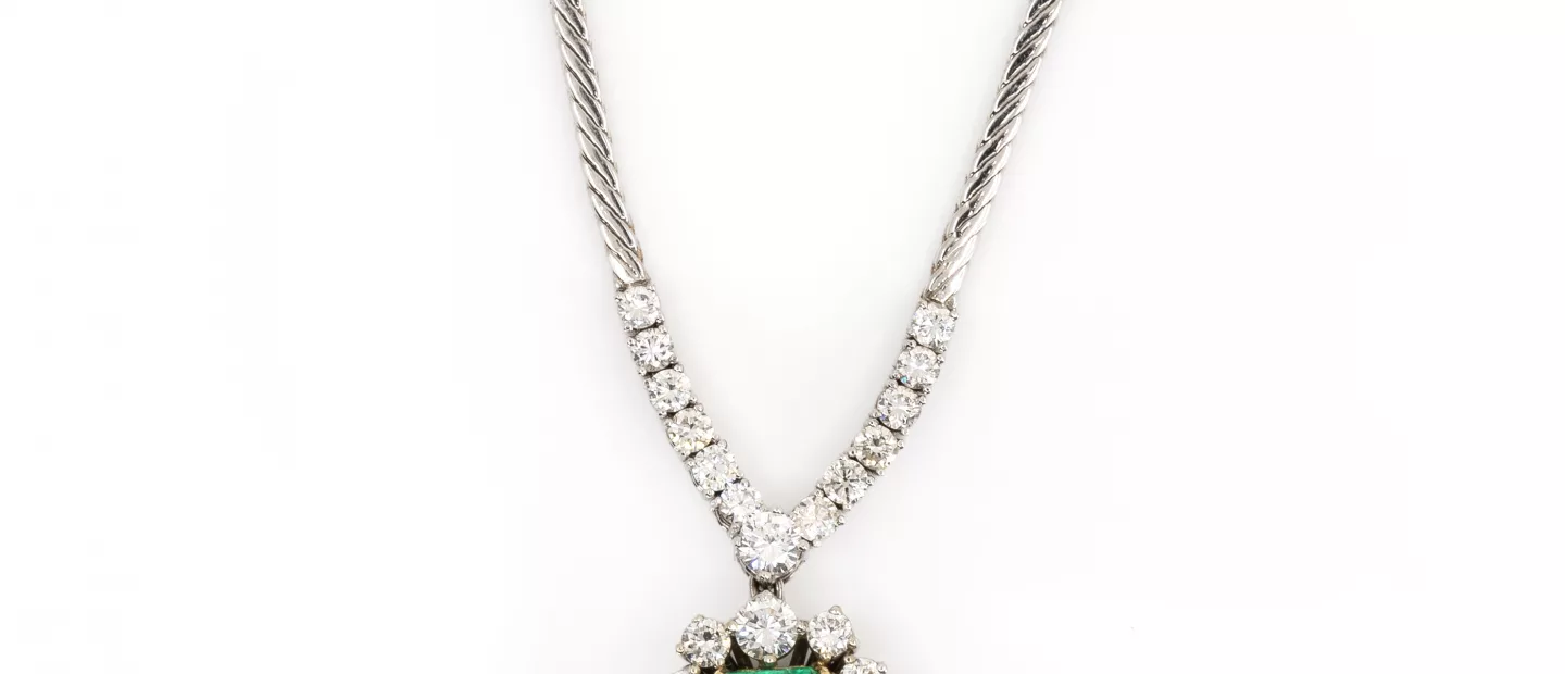 Smaragd-Diamantcollier: 750 Weißgold, punziert, 26 Diamanten im Brillant- und Tropfenschliff, die runden Diamanten gesamt ca. 3,02 ct,...