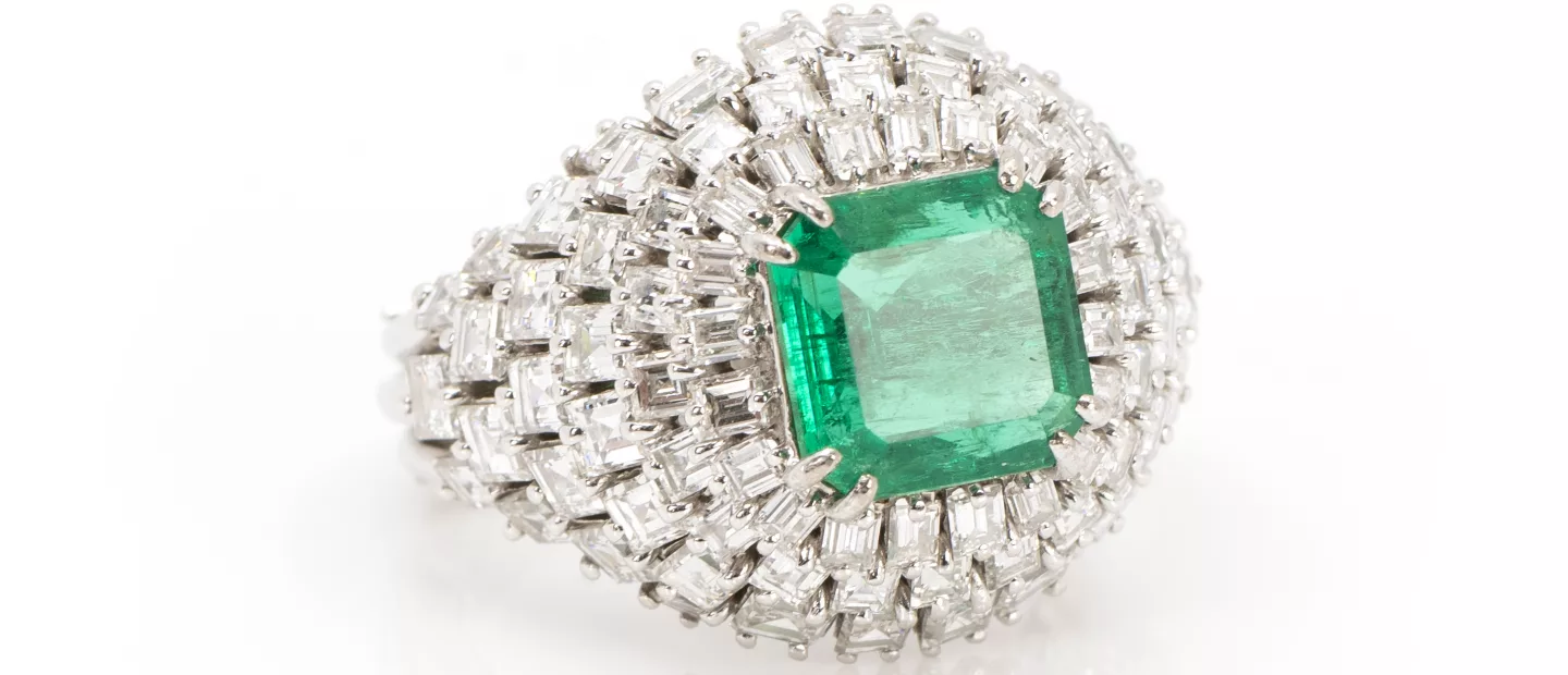 Smaragd-Diamantring: 750 Weißgold, punziert, 88 Diamanten im Baguetteschliff, gesamt ca. 3,49 ct, G, if, Smaragd im Achtkantschliff,...