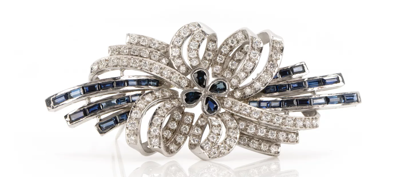 Saphir-Diamantbrosche: 750 Weißgold, geprüft, 108 Diamanten im Brillantschliff, gesamt ca. 5,40 ct, H, si, 36 Saphire im Baguette-...