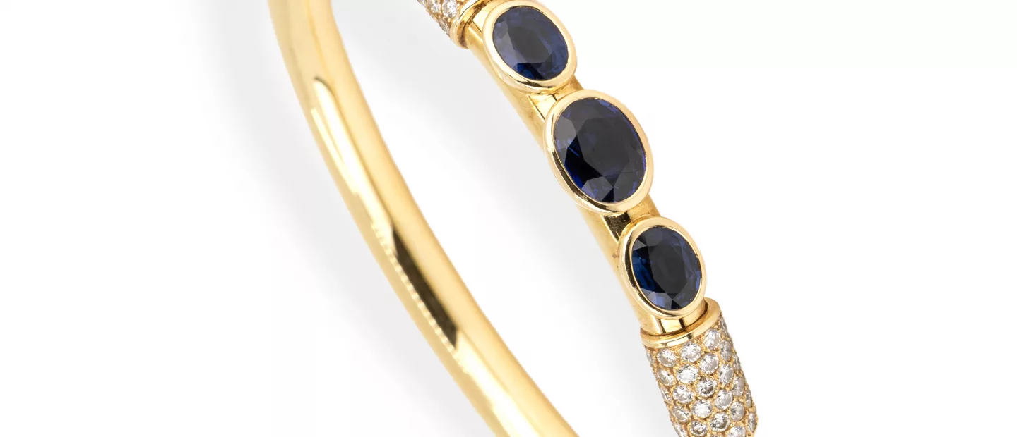 Gübelin Saphir-Diamant-Armreif: Gübelin, Schweiz, 750 Gelbgold, punziert, sowie Markenpunze, 74 Diamanten im Brillantschliff, gesamt...