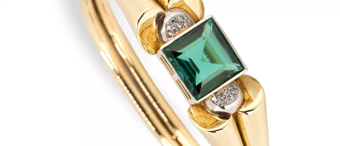 Turmalin-Diamantarmreif: 585 Gelb- und Weißgold, punziert, 16 Diamanten im Brillantschliff, Turmalin im Carreeschliff, ca. 10,45 ct,...