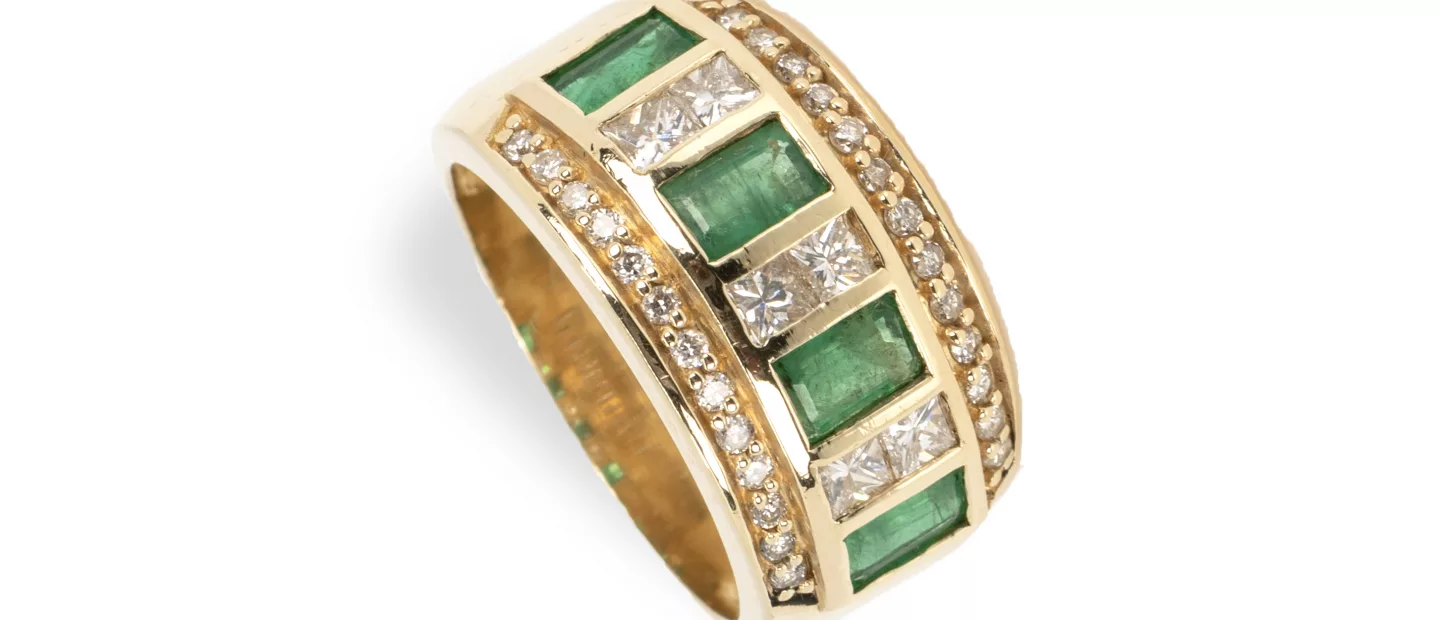 Smaragd-Diamantring: 585 Gelbgold, punziert, 31 Diamanten im Brillant- und Prinzessschliff, gesamt ca. 0,55 ct, H-I, si-pi, 4 Smaragde...