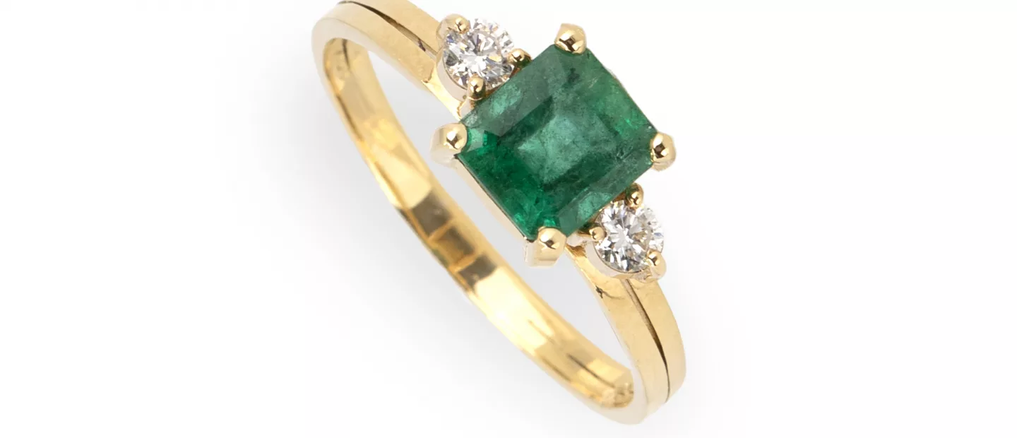 Smaragd-Diamantring: 750 Gelbgold, punziert, 2 Diamanten im Brillantschliff, gesamt ca. 0,15 ct, G, vvs, Smaragd im Carreeschliff ca....