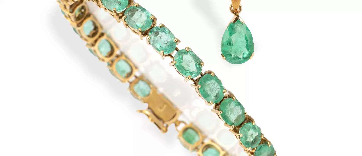 Smaragdarmband und Anhänger: 2-tlg., 750 Gelbgold, punziert, Armband mit 27 oval facettierten, brasilianischen Smaragden, gesamt 17,00...