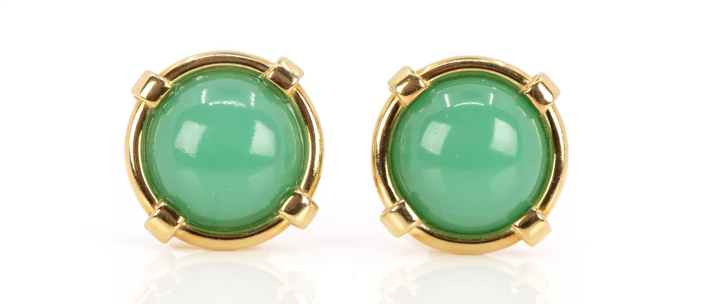 Chrysopras-Ohrclips: 750 Gelbgold, punziert, Chrysopras im Cabochonschliff, jeweils ca. 11,00 ct, Ø ca. 1,5 cm, Gesamtgewicht ca. 25