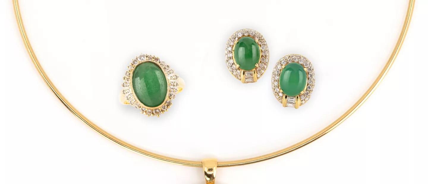 Chrysopras-Diamant-Schmuckset: 4-tlg., Anhänger Gübelin, 750 Gelbgold, punziert, sowie Markenpunze, Kette, Ohrclips und Ring...
