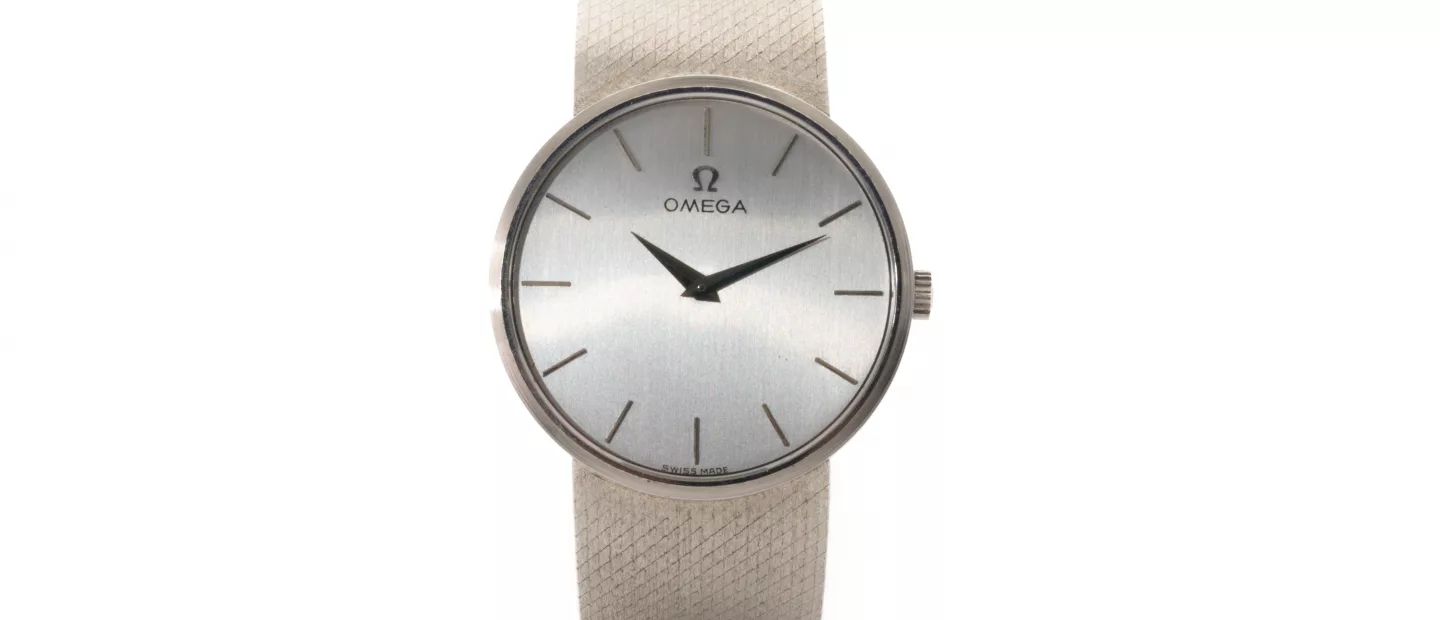 Omega Vintage Uhr: 1970er Jahre, Automatik, Werk-Nr. 35924420, Gehäuse 585 Weißgold, silberfarbenes Zifferblatt, Durchmesser 33 cm,...