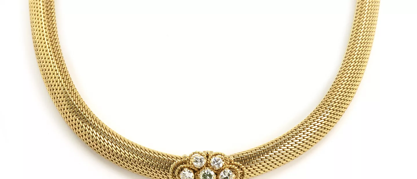 Diamantcollier: 750 Gelbgold, punziert, aufklappbare Verschlussklappe mit 7 Diamanten im Brillantschliff, gesamt ca. 1,18 ct, zentraler...