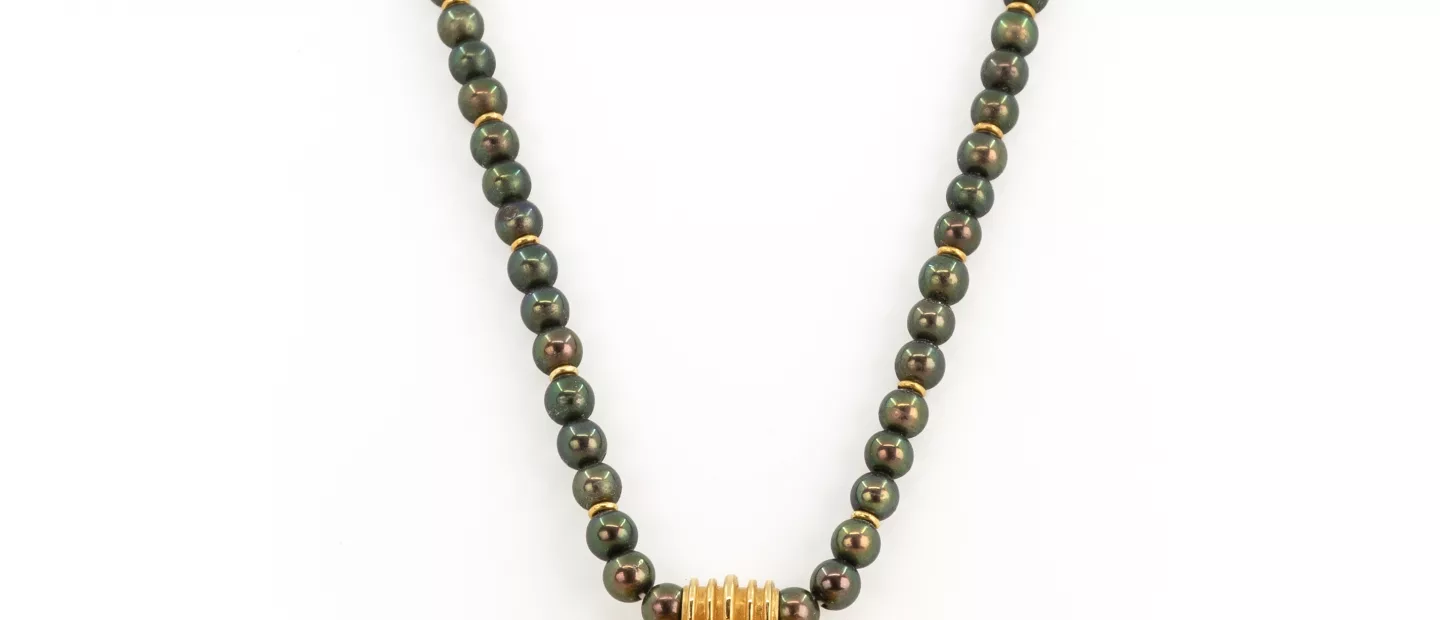 Citrin-Perlencollier: Otto Hahn, Bielefeld, 750 Gelbgold, punziert, dazu Markenpunze, facettierter Citrin im Ovalschliff, ca. 24,40 ct,...