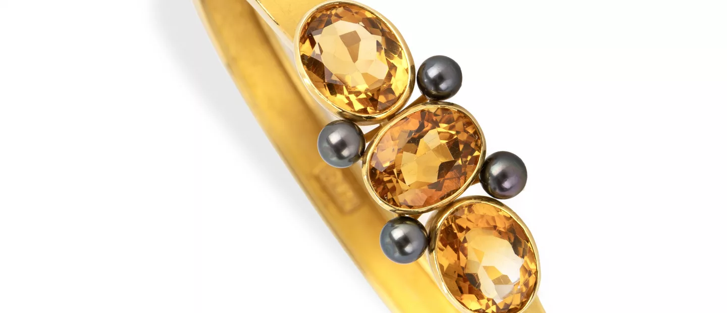 Citrin-Perlarmreif: Otto Hahn, Bielefeld, 750 Gelbgold, punziert, dazu Markenpunze, 3 facettierte Citrine im Ovalschliff, gesamt ca....