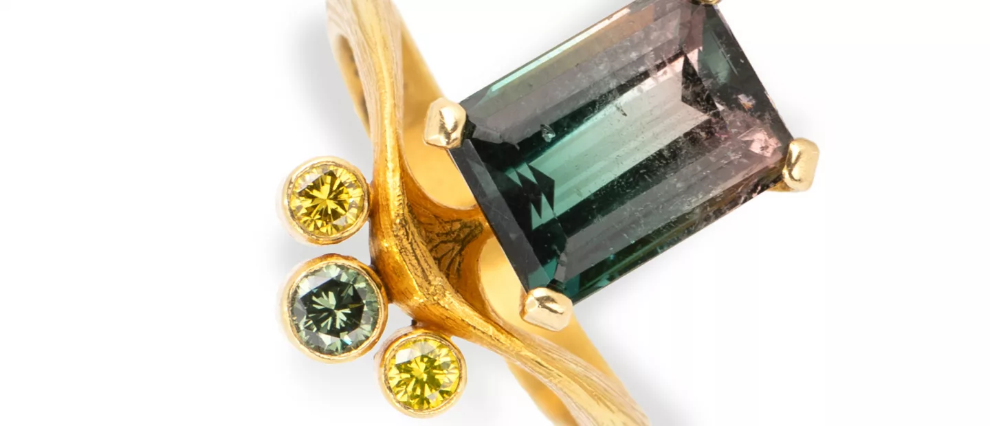 Turmalin-Diamantring: 750 Gelbgold, punziert, 3 Diamanten im Brillantschliff, gesamt ca. 0,30 ct, gelb und grün, facettierter,...