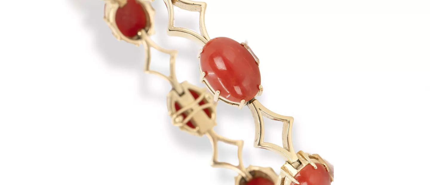 Korallen-Armband: 585 Gelbgold, punziert, 8 Korallen im Cabochonschliff, gesamt ca. 25 ct, Länge 19,8 cm, Gewicht ca. 27