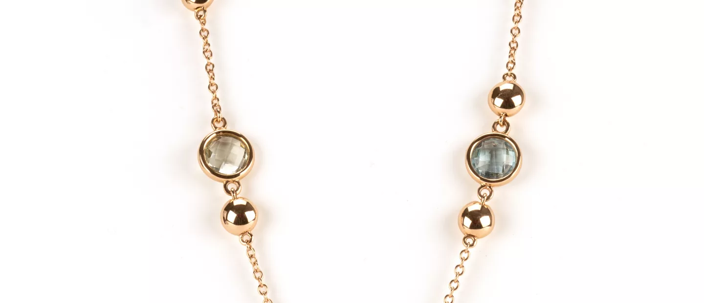 Wempe Edelstein-Collier: Wempe, 750 Roségold, punziert sowie Markenpunze, 7 runde, facettierte Edelsteine, darunter ein blauer...