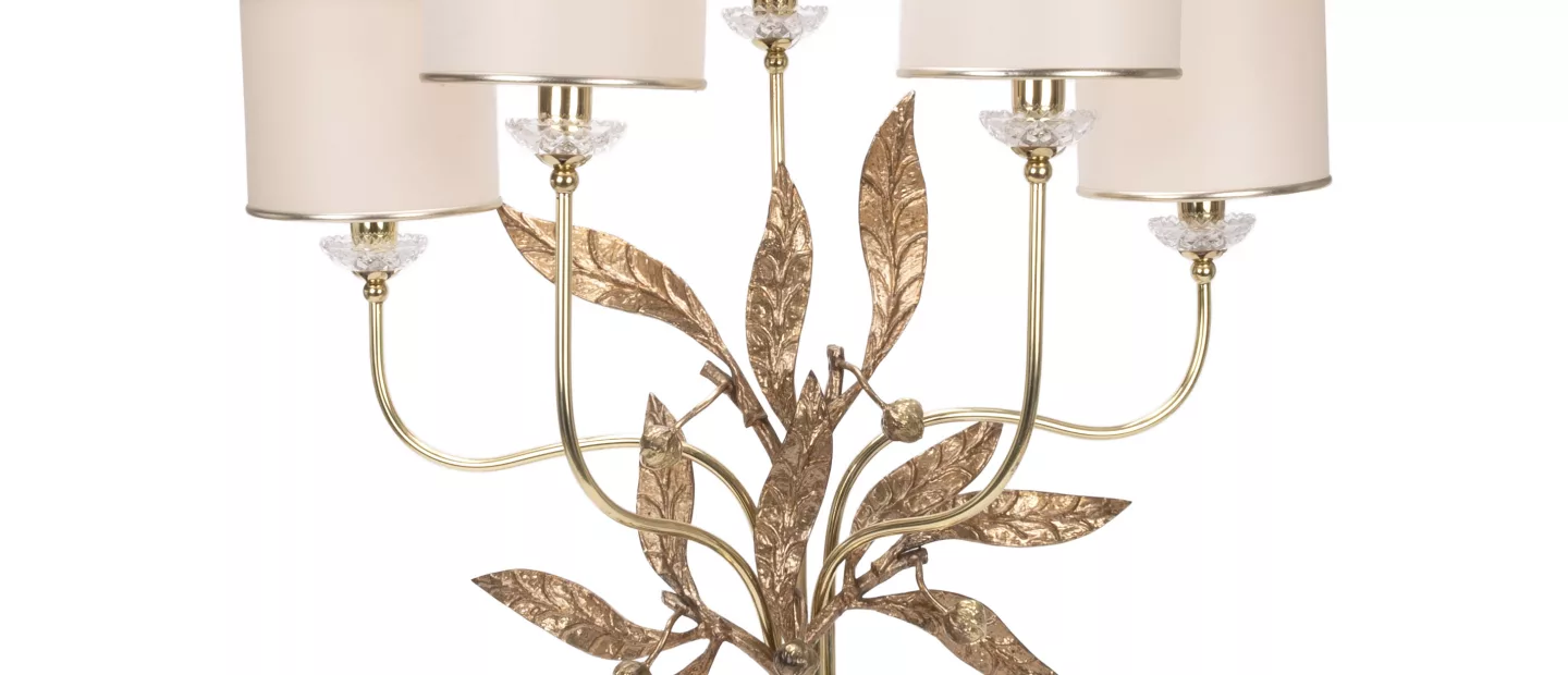 Florale Lampe (vermultich Kokosnusspalme) mit fünf Lampenschirmen, Entwurf von Hans Kögl: Entwurf von Hans Kögl, 1970er Jahre,...