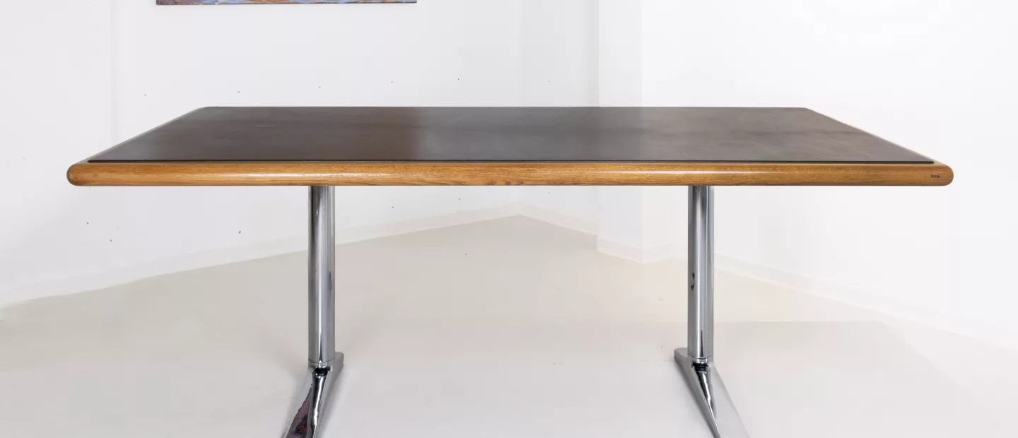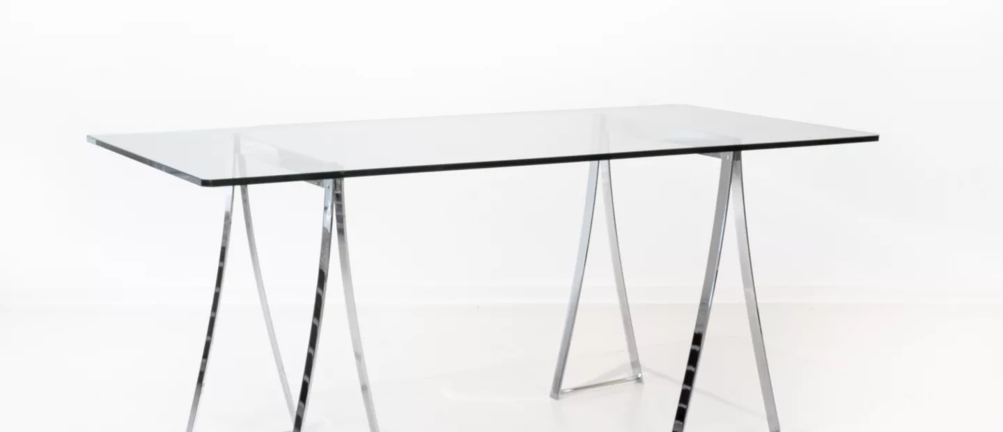 Ghyczy + Co Esstisch: Ghyczy + Co, Niederlande, Stahl und Glas, Herstelleretikett auf einem der Böcke, 79,5 x 160 x 73 cm, Zustand B,...