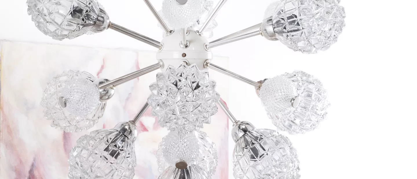 Sputnik Kronleuchter: Entwurf von Richard Essig, Glas, Kunststoff, Metall, Höhe 73 cm, Zustand B/C, Gebrauchs- und Altersspuren,...