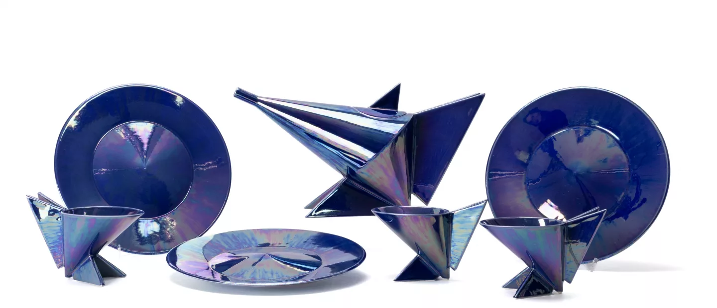 Villeroy & Boch Designservice 'Blue Magic': 7-tlg., Villeroy & Boch, Mettlach, 1987/88, Porzellan, metallic-blau changierend gefasst,...