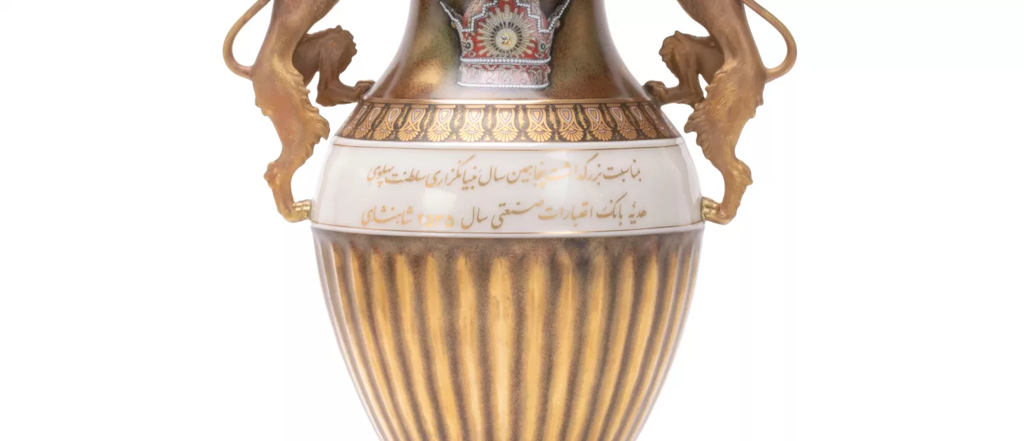 Hutschenreuther Pahlavi-Vase: Hutschenreuther, 1977, Porzellan, farbig bemalt und gold staffiert, modelliert nach einem altpersischem...