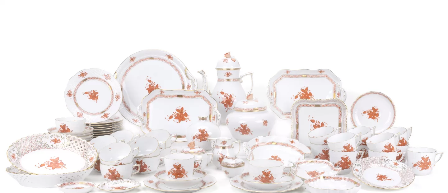 Herend Tee- und Kaffeeservice 'Apponyi orange': 84-tlg., Herend, Ungarn, Ende 20. Jh., Porzellan, weiß, monochrom bemalt und gold...