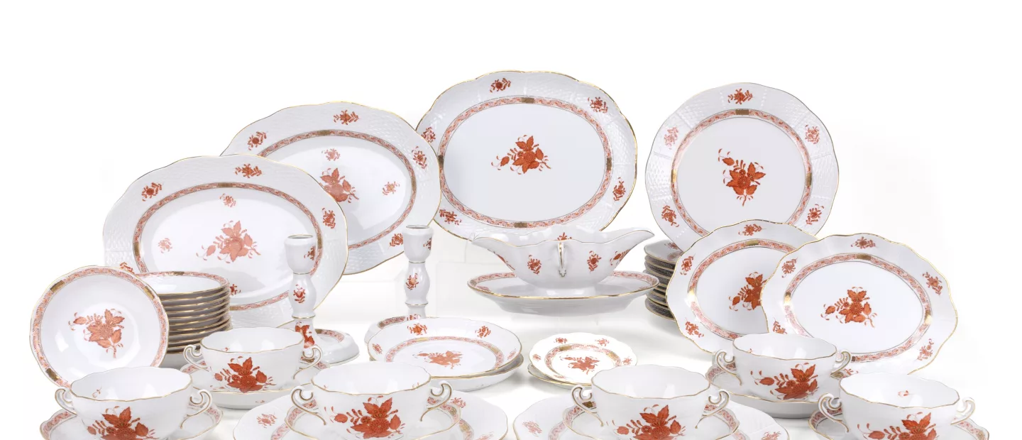 Herend Speiseservice 'Apponyi orange': 76-tlg., Herend, Ungarn, Ende 20. Jh., Porzellan, weiß, monochrom bemalt und gold staffiert,...
