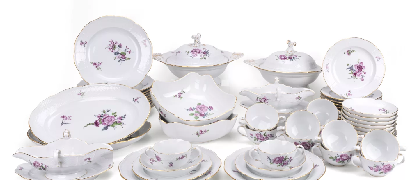 Meissen Speiseservice Blumenmalerei in Purpur-Camaieu: 56-tlg., Meissen, Ende 20. Jh., Porzellan, weiß, purpurfarbene alte...