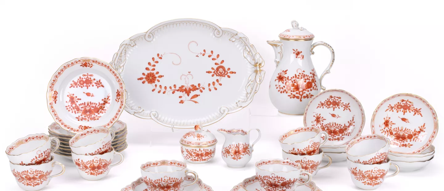 Meissen Kaffeeservice 'Indisch rot': 34-tlg., Meissen, Ende 20. Jh., Porzellan, weiß, korallenrote Malerei, gold staffiert, 10...