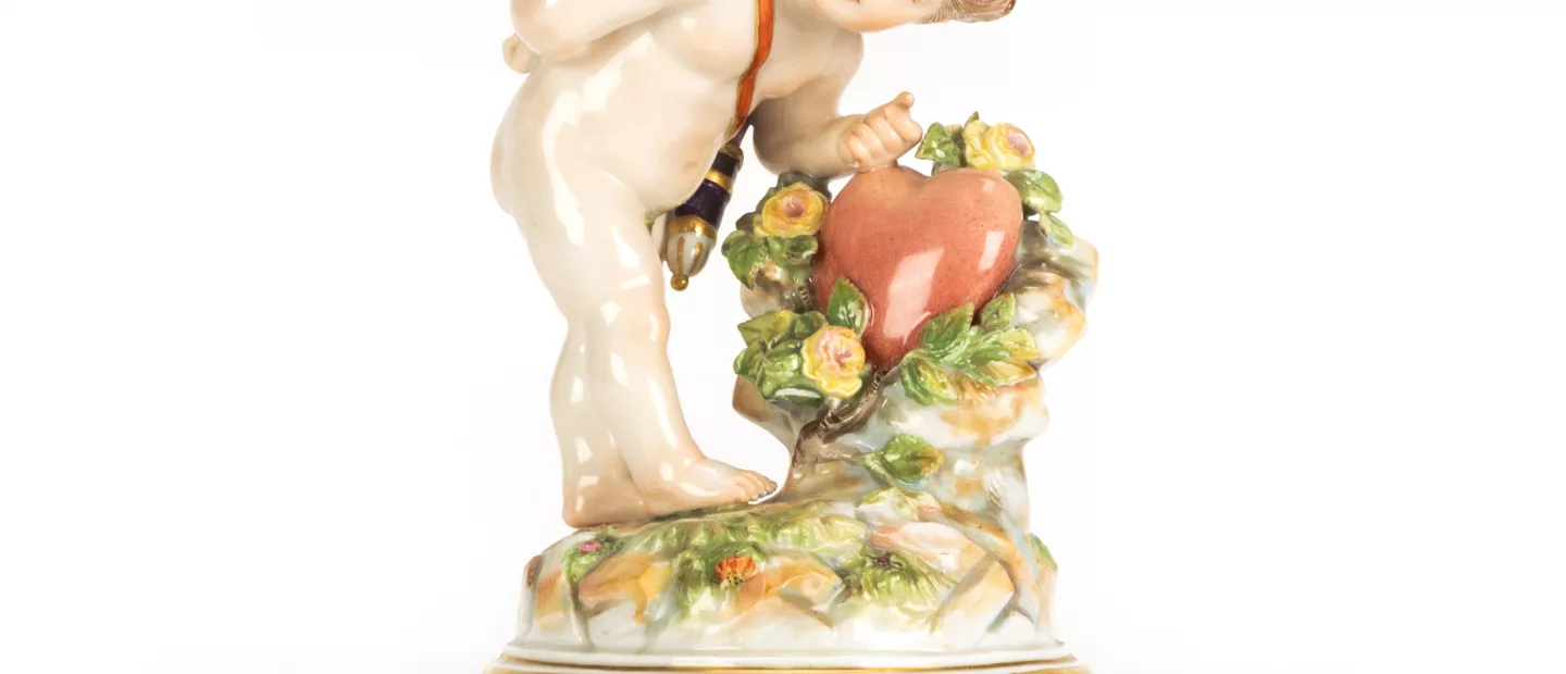 Meissen Figur Amor an ein Herz klopfend: Meissen, Modell von Heinrich Schwabe 1877 - 1880, Knaufzeit, Porzellan, weiß, farbig...