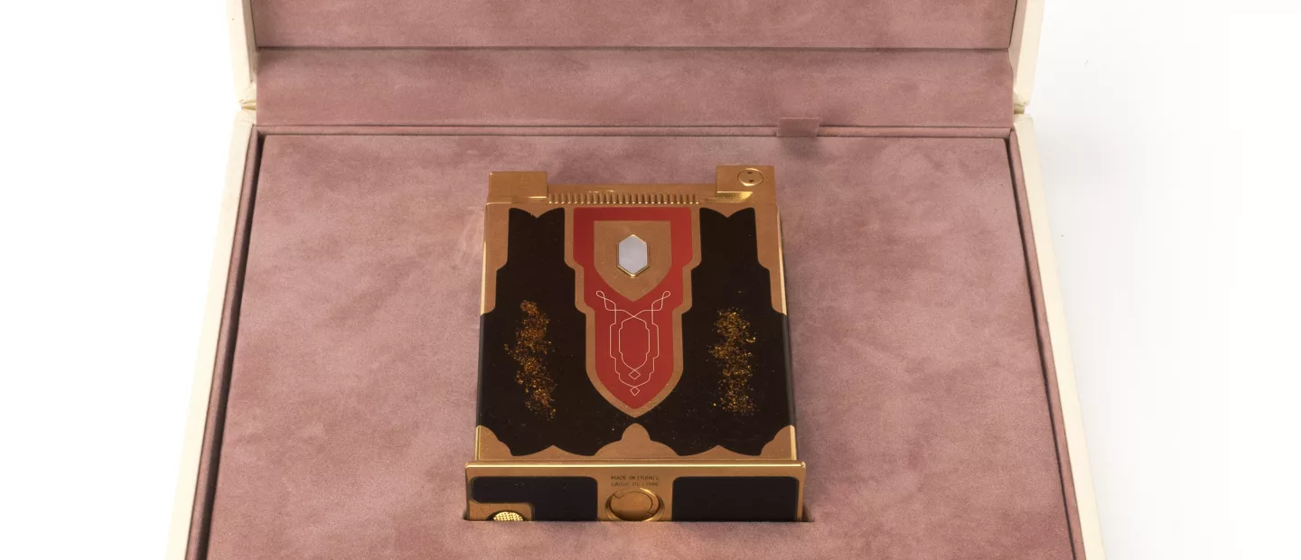 S.T. Dupont Jeroboam (Tisch-) Feuerzeug 'Maharadjah': S.T. Dupont, Frankreich, 1998, vergoldetes Metall, roter und schwarzer...