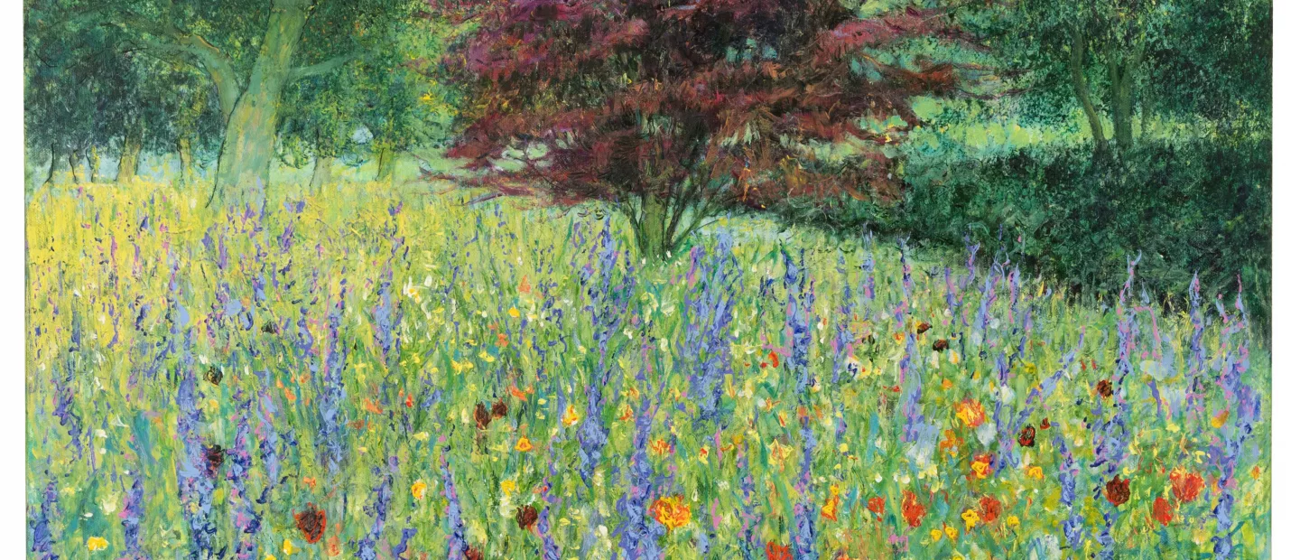 'Garten mit Ahorn und Lupinen', Mischtechnik auf Leinwand, 100 cm x 100 cm Leinwandmaß, monogrammiert, verso betitelt