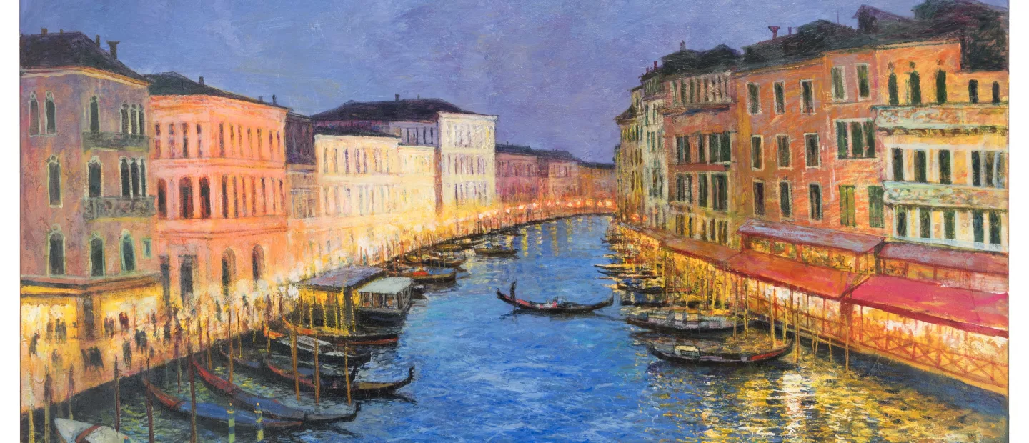 'Blick von der Rialto Brücke', Mischtechnik auf Leinwand, 100 cm x 140 cm Leinwandmaß, monogrammiert, verso betitelt