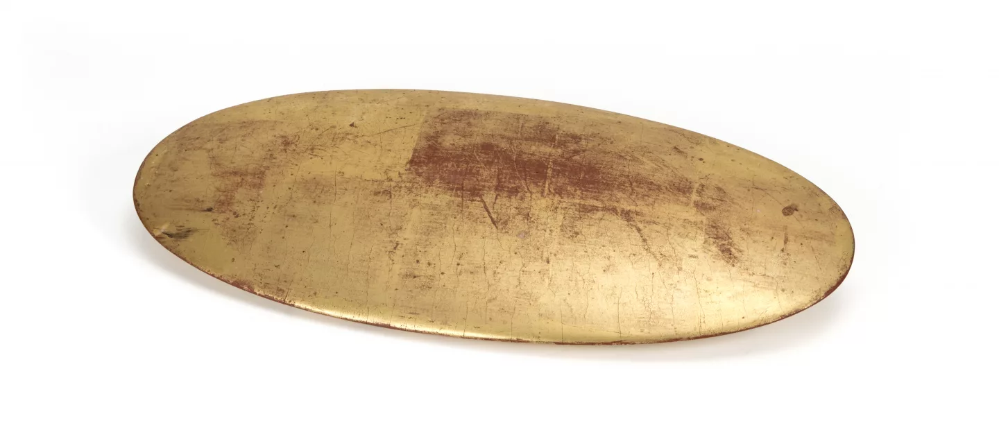 Ellipse, Blattgold über Gips auf Holz, Länge 44,5 cm x 21 cm x 4 cm Objektmaß, monogrammiert, 80 datiert, craqueliert, partiell kleine...
