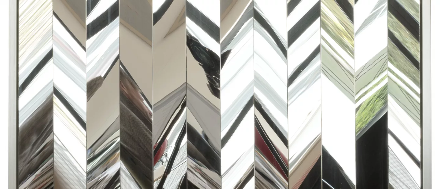'Spiegelfaltungen II', 12 schmale Spiegel, versetzt, auf Holz montiert, in Aluminiumrahmen gefasst, 101 cm x 101 cm Objektmaß, verso...