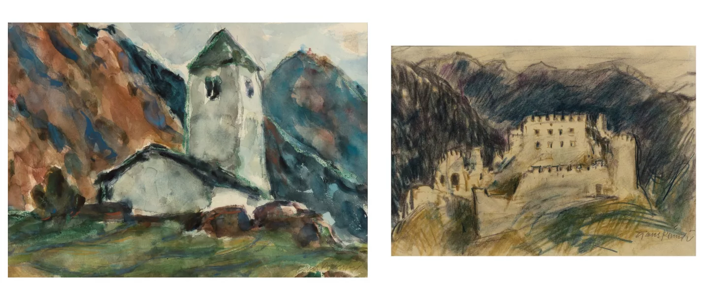 Bergkirche und Burg in Südtirol, zwei Alpenansichten, Bergkirche Gouache auf Karton, 26 cm x 38 cm Sichtmaß, signiert, montiert, etwas im...