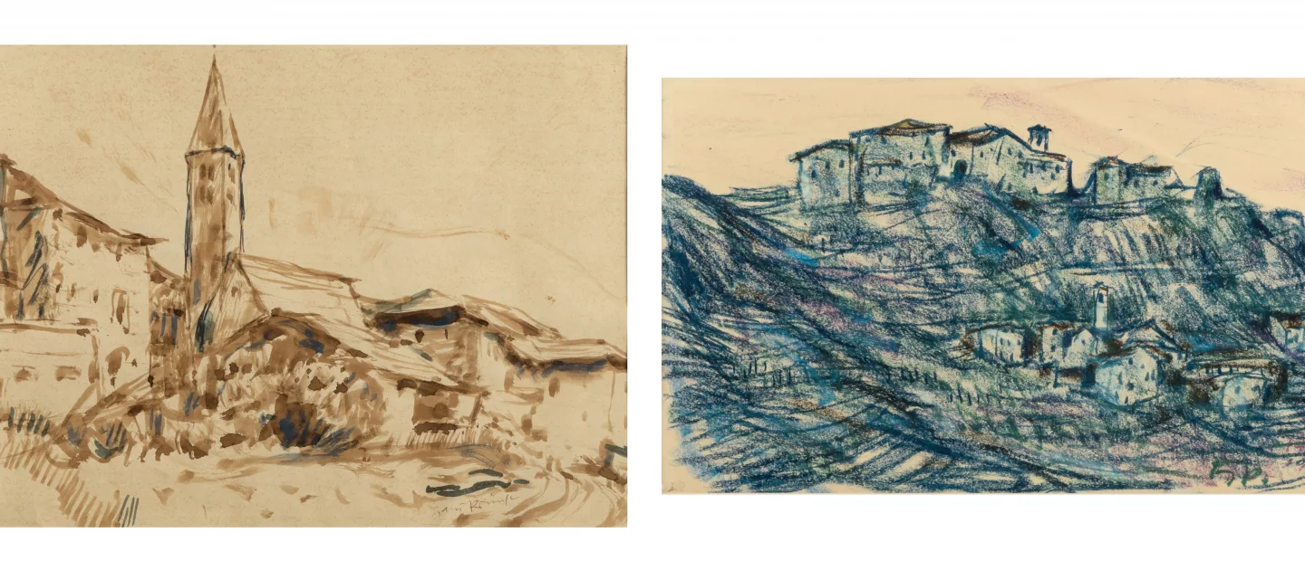 'Schrambach' und Dorf in den Südtiroler Bergen, zwei Alpenansichten, 'Schrambach' Aquarell auf chamoisefarbenem Papier, 27 cm x 37,5 cm...