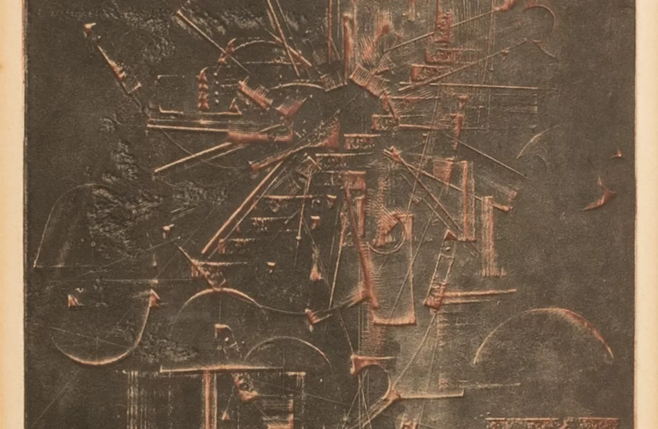 Ohne Titel, Farbaquatintaradierung auf Papier, 24,5 cm x 19 cm Sichtmaß, signiert, 1959 datiert, partiell leicht stockfleckig, etwas...