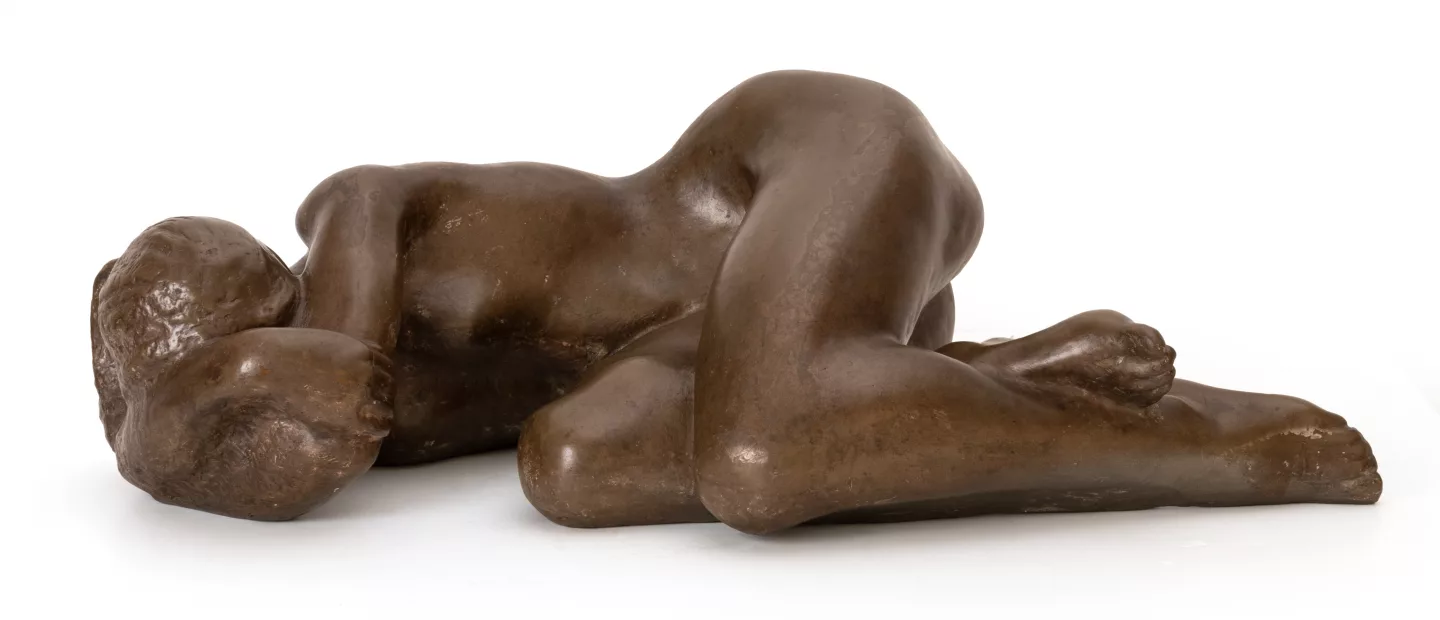 'Die Kauernde', Erstabguss, Polymer-Gussmaterial, braun lasiert, Länge 70 cm, im Guss signiert, 60 datiert, Spannungsrisse, partiell...