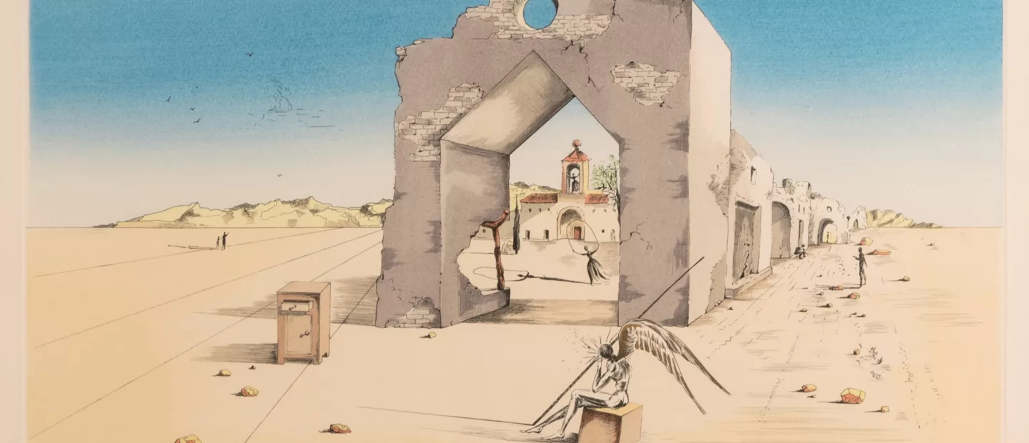La Banlieue de la ville Paranoiaque-Critique (Die Vorstadt Paranoia-Kritik), Farbaquatintaradierung auf Papier, 1974, 39 cm x 55,5 cm...