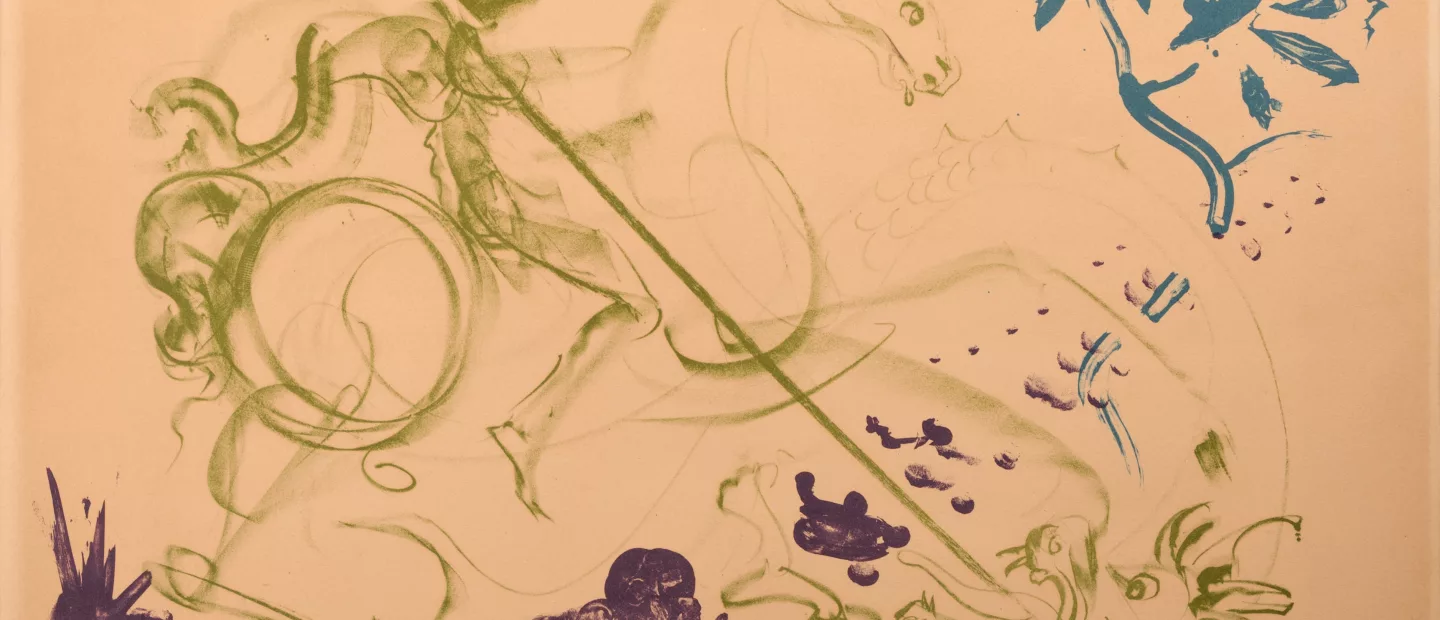 Der Heilige Georg mit dem Drachen, Farblithografie auf Arches (Wasserzeichen), 46,5 cm x 67 cm Darstellungsmaß, 56 cm x 70 cm Blattmaß,...