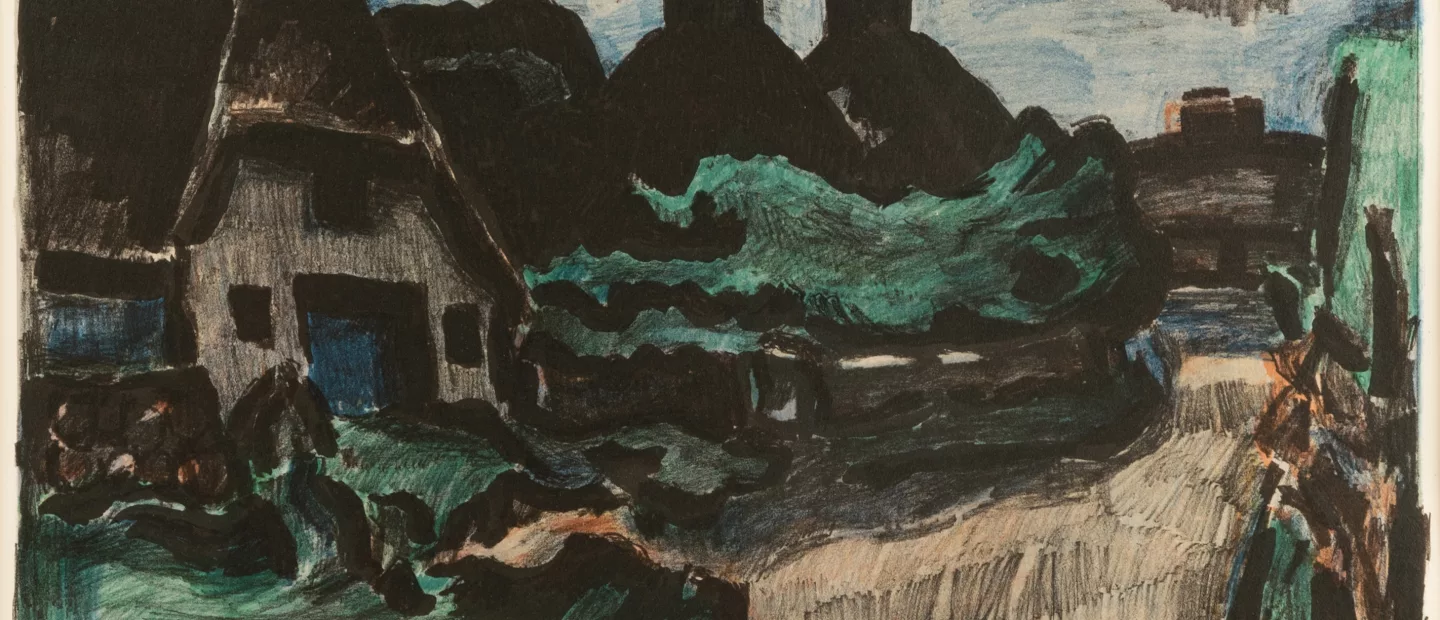 Nächtliche Straße in Keitum/Sylt, Farblithografie auf Papier, 49 cm x 63 cm Sichtmaß, signiert, minimal gewellt, lichtrandig, montiert