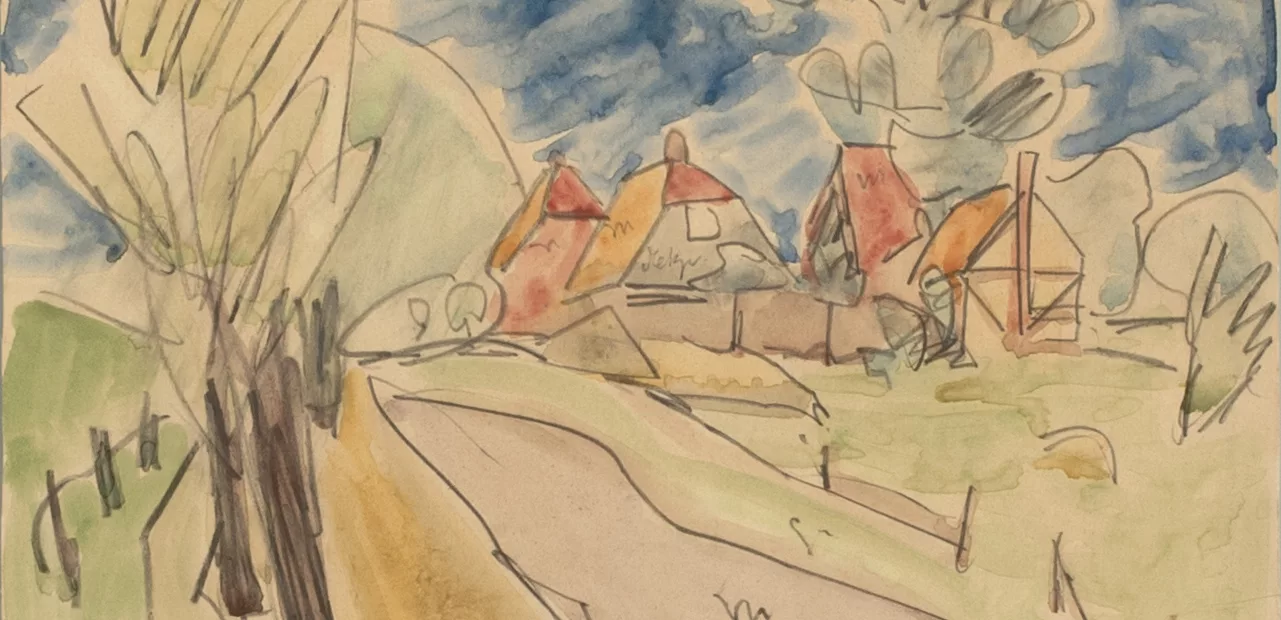 'Dorfweg', Aquarell über Bleistift auf festem Papier, 27 cm x 36,5 cm Blattmaß, signiert, monogrammiert, 13 datiert, betitelt, montiert,...