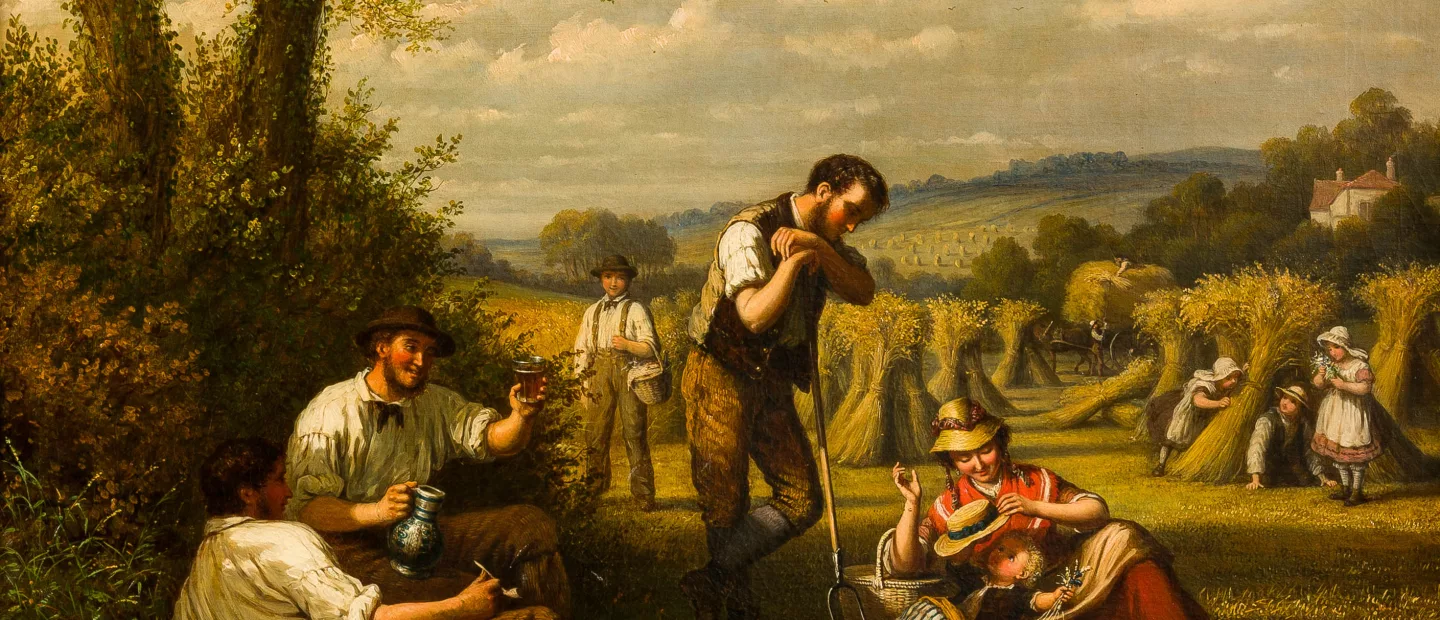 Mittagspause bei der Kornernte, Öl auf Leinwand, 63,5 cm x 76 cm Leinwandmaß, signiert, 1866 datiert, doubliert, craqueliert, minimale...