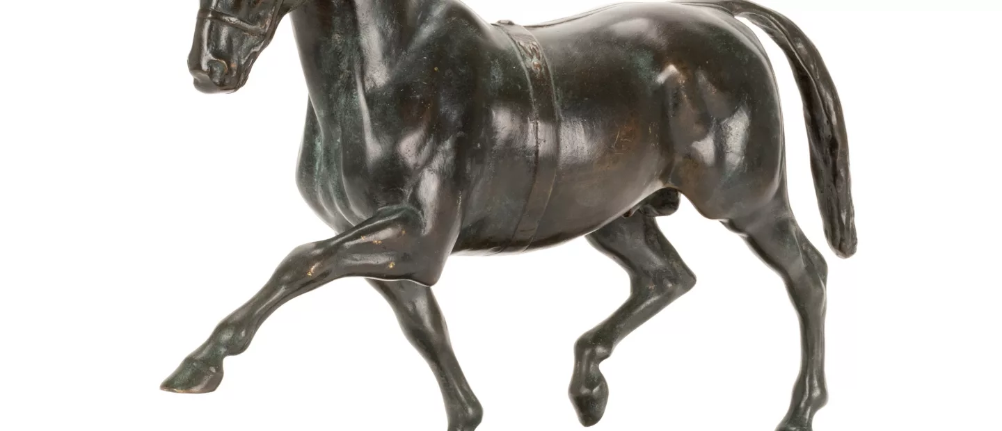 Hengst Amok von Amoroso-Morgenland, Bronze, dunkel patiniert, 30,5 cm x 39 cm x 10 cm Objektmaß, signiert, betitelt 'Beschäler in Wietzow'...