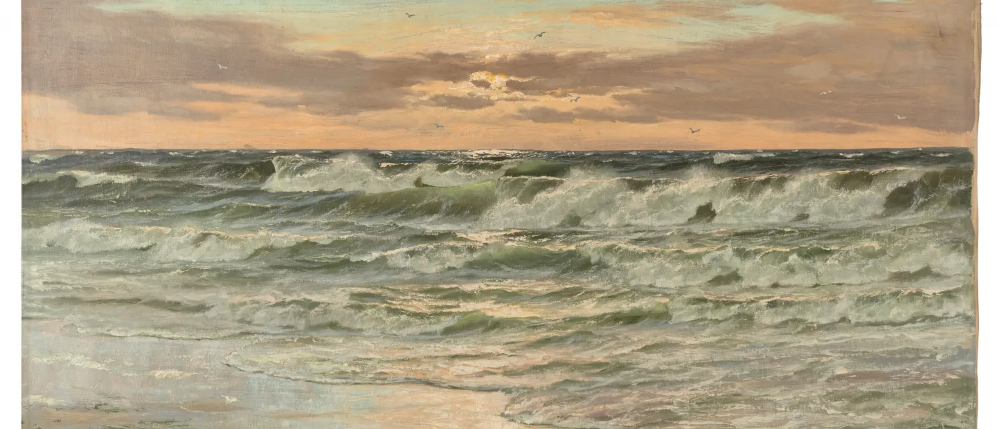 Meeresbrandung bei Sonnenuntergang, Öl auf Leinwand, 60 cm x 90 cm Leinwandmaß, signiert, partiell leicht craqueliert,...