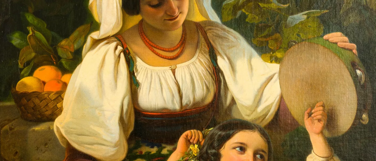 Mutter und Tochter in Tracht der Albaner Berge unter einem Orangenbaum, Öl auf Leinwand, 120 cm x 97 cm Leinwandmaß, signiert, 1843...
