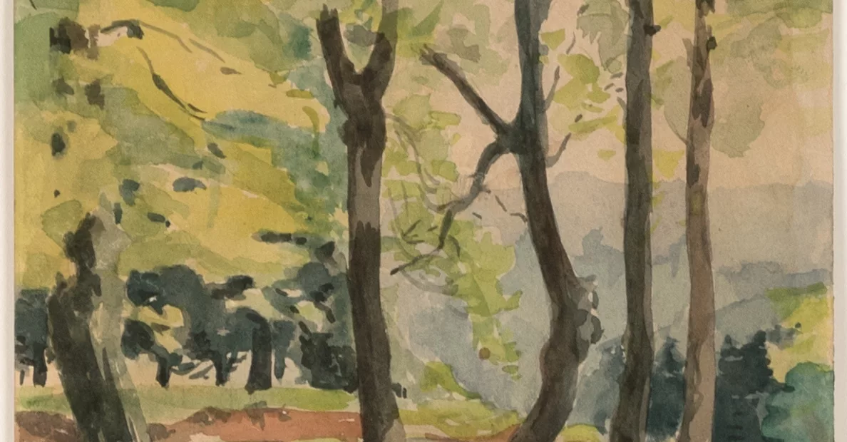 Waldblick, Aquarell auf Papier, 25 cm x 16,5 cm Blattmaß, signiert, leicht nachgedunkelt, Blattrand partiell minimal beschädigt, montiert