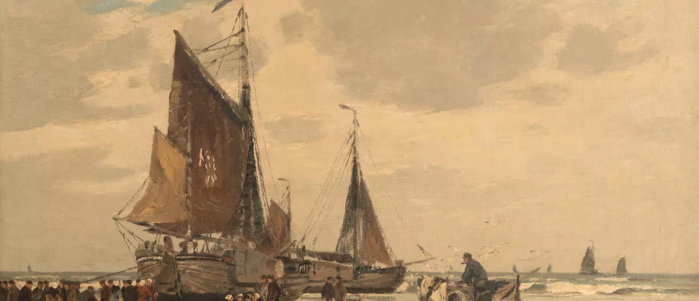 Fischerboote am Strand, Öl auf Leinwand, 70,5 cm x 100 cm Leinwandmaß, signiert, doubliert, partiell leicht craqueliert, partiell...