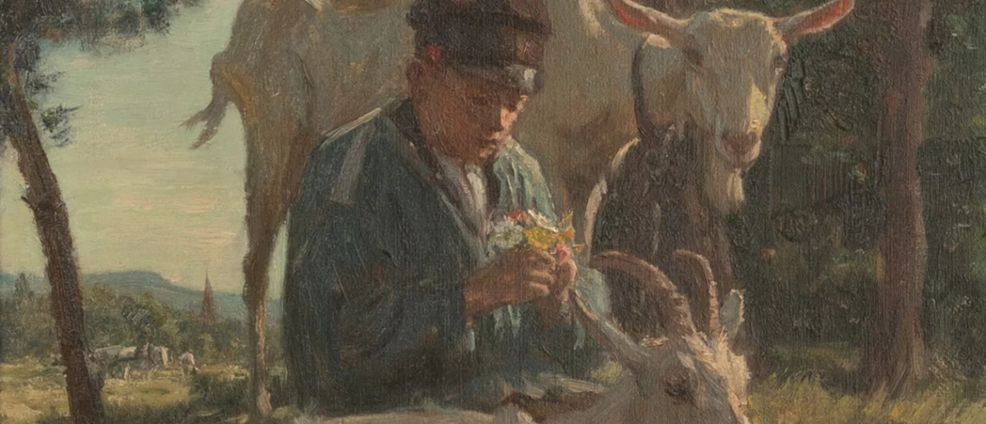 Ziegenhirte beim Blumenpflücken, Öl auf Leinwand, 40,5 cm x 31 cm Leinwandmaß, signiert